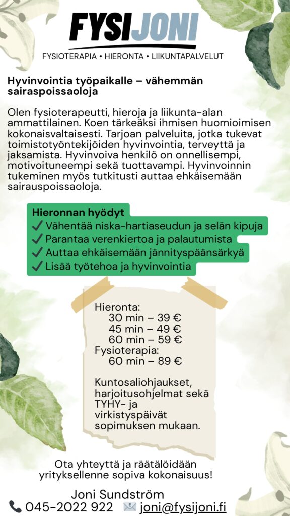 HIERONTA Teen myös kotikäyntejä pk-seudulla. Kotikäyntilisä alk.10 euroa. Hintaan vaikuttaa sijainti ja onko samassa paikassa mahdollisesti useampi hieronta. Kysy tarjous!